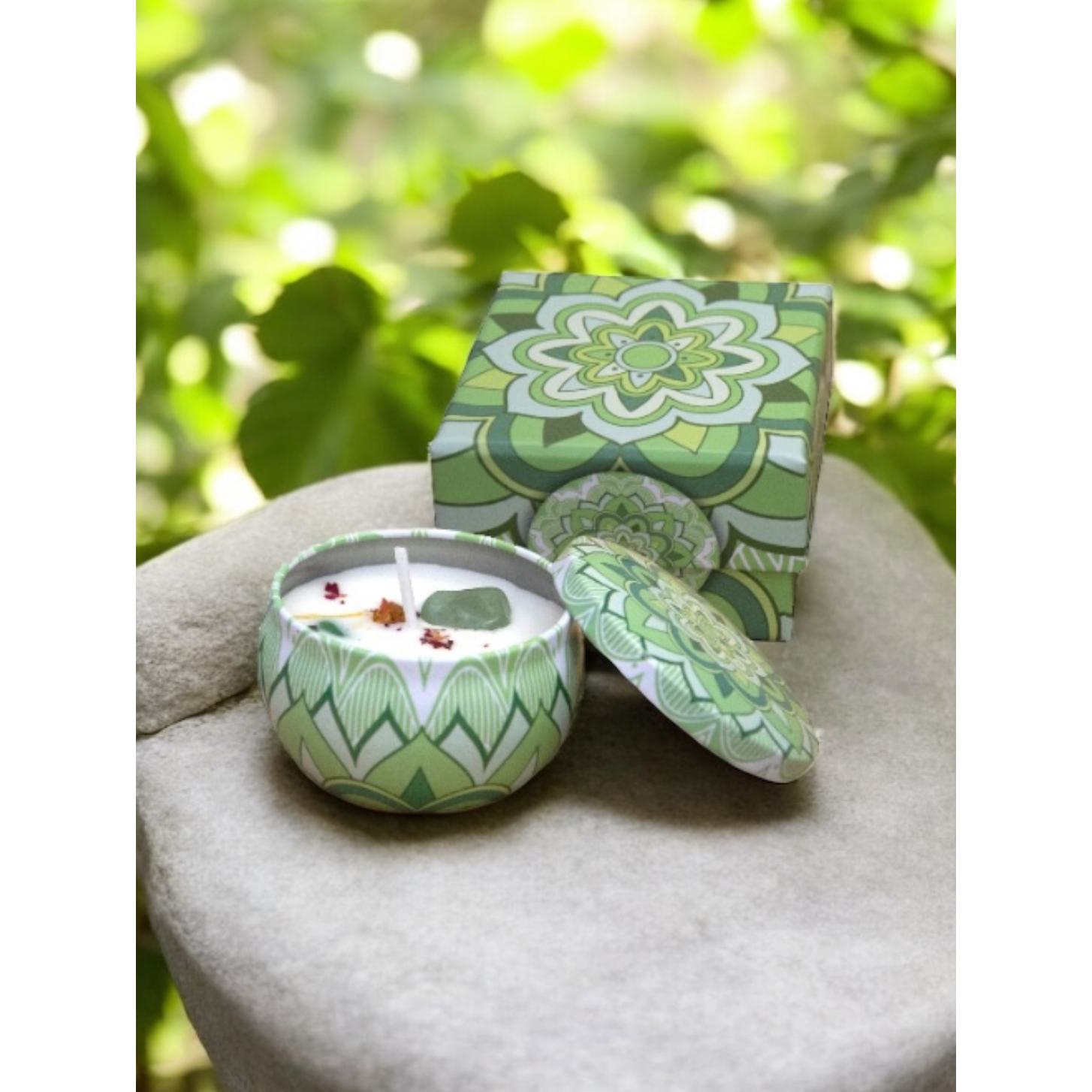 Elegantísima vela vegana de 7 centímetros con aroma a vainilla e incrustaciones del Mineral Aventurina Verde.